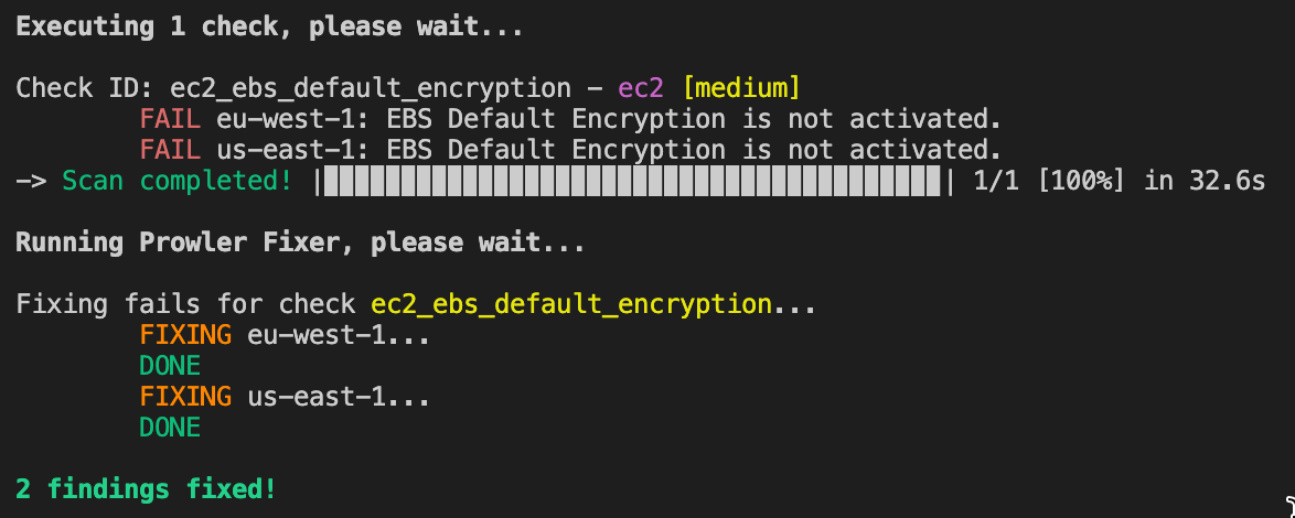 For example, the regional fixer for the ec2_ebs_default_encryption check, which enables EBS encryption by default in a region, would look like this: